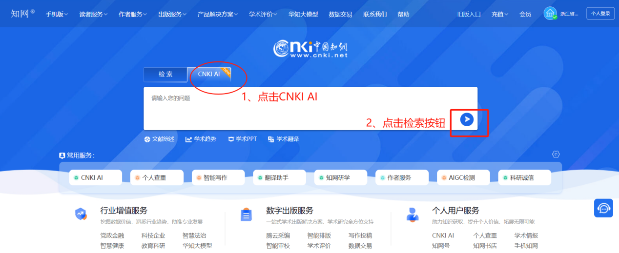 1、在学校IP范围内,登录知网总库(cnki.net),点击CNKI AI检索按钮